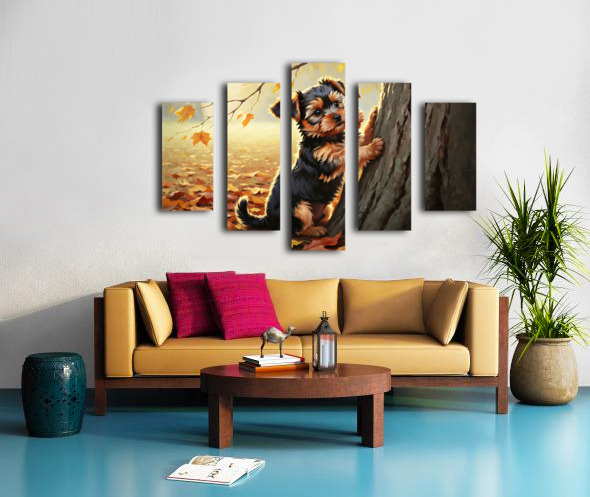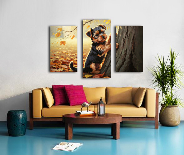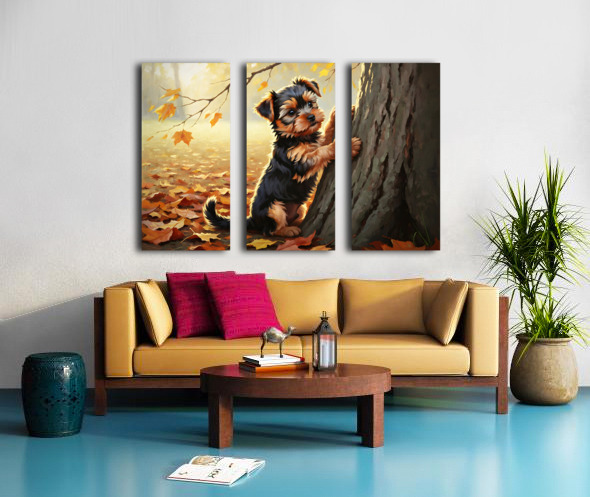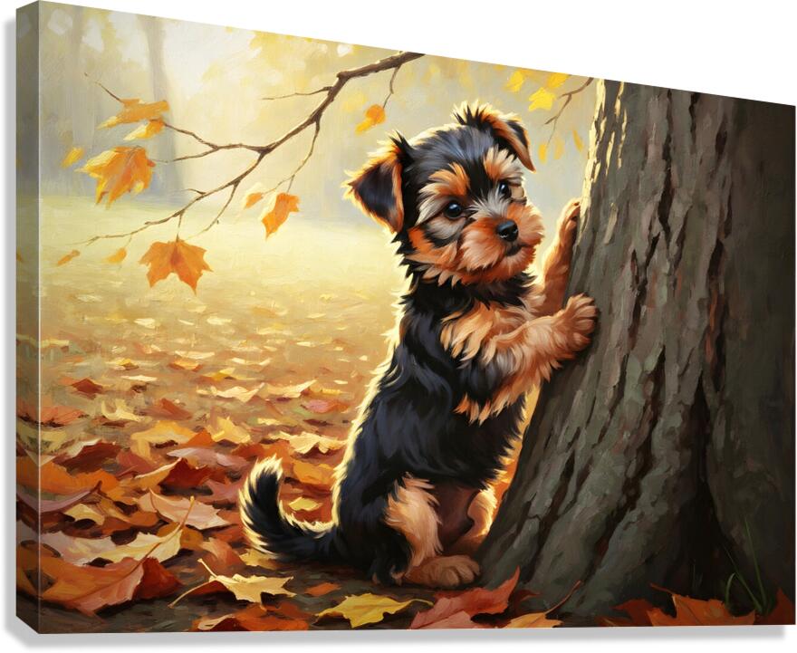 Yorkshire Terrier Puppy Spots Squirrel At Tree Base Impression sur toile