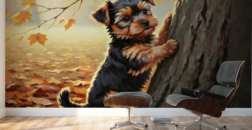 A tiny Yorkshire Terrier puppy with glossy brown and tan coat stands at the bottom of a tall tree gazing upward with bright excited eyes and wagging tail surrounded by colorful wildflowers Digital Artwork.