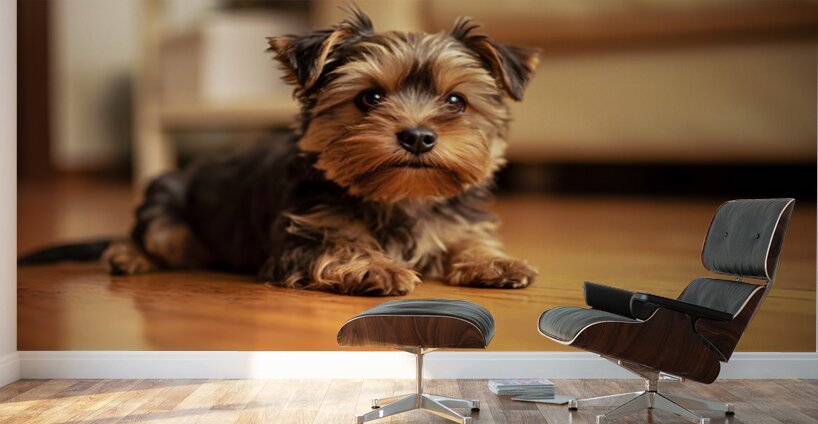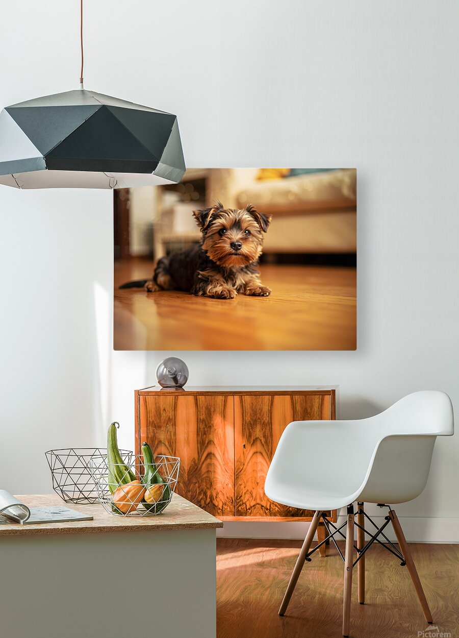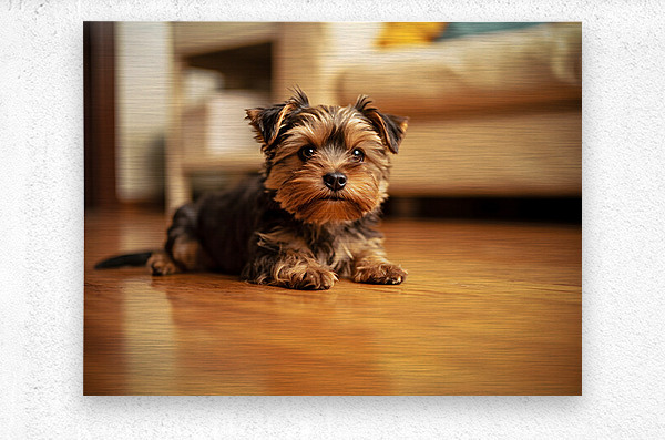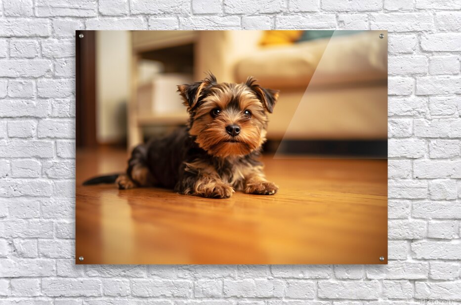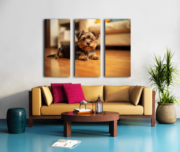 SUR CETTE OEUVRE: YORKSHIRE TERRIER PUPPY CAUGHT CLIMBING FORBIDDEN SOFA