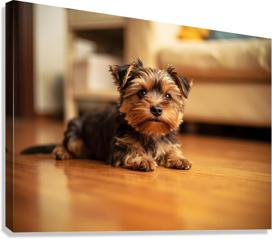 Yorkshire Terrier Puppy Caught Climbing Forbidden Sofa Impression sur toile