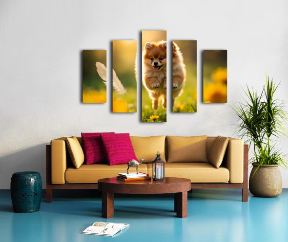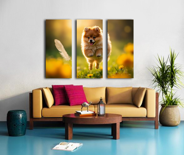Feather Lands On Happy Pomeranian Puppy Impression sur toile