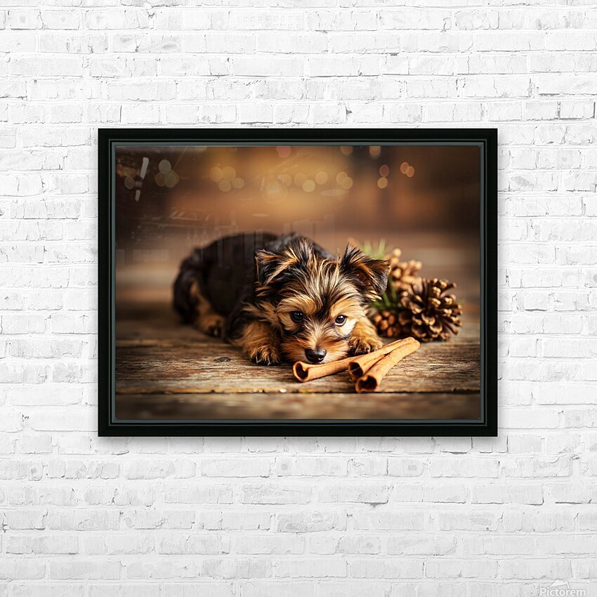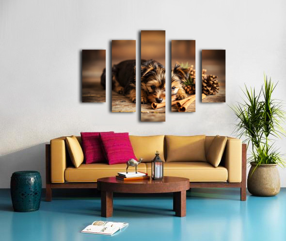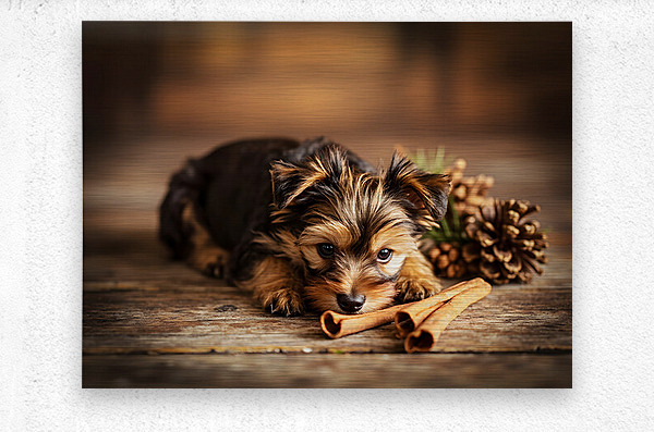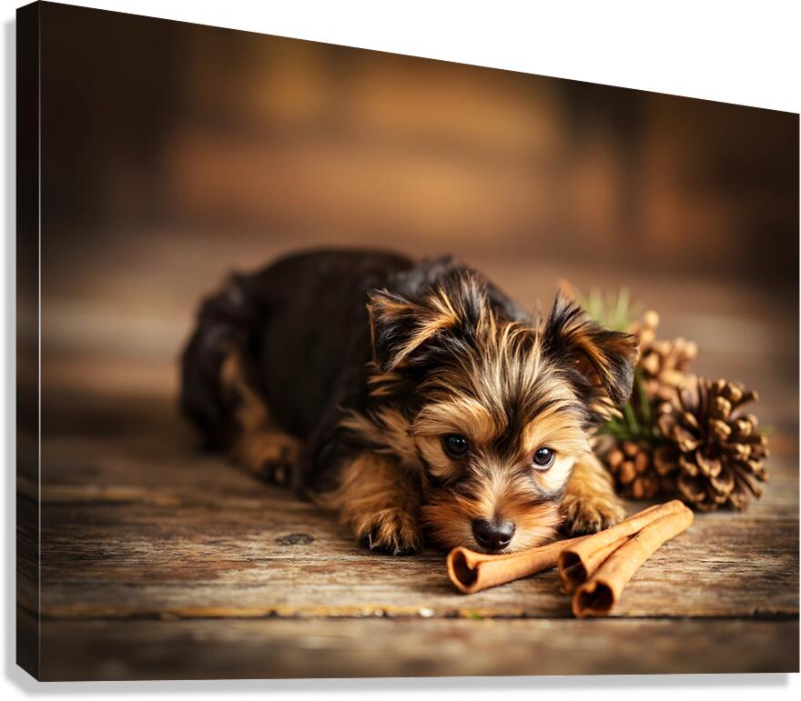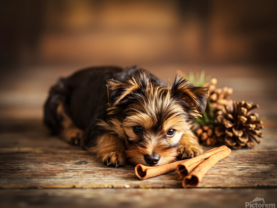 An alert Yorkshire Terrier puppy with fluffy brown and tan coat sits contentedly surrounded by cinnamon sticks and pine cones appearing satisfied with its scent exploration adventure in warm indoor lighting Digital Artwork.