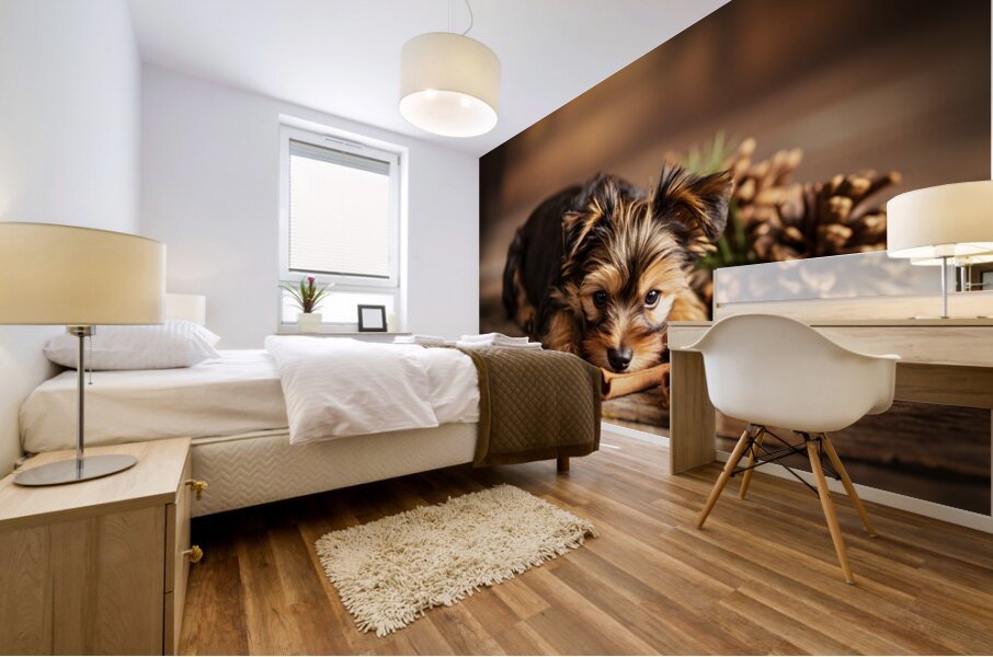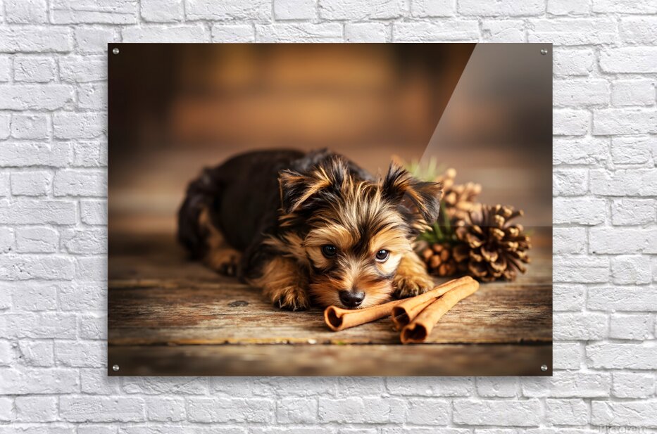 SUR CETTE OEUVRE: HAPPY YORKSHIRE TERRIER PUPPY WITH NATURE TREASURES