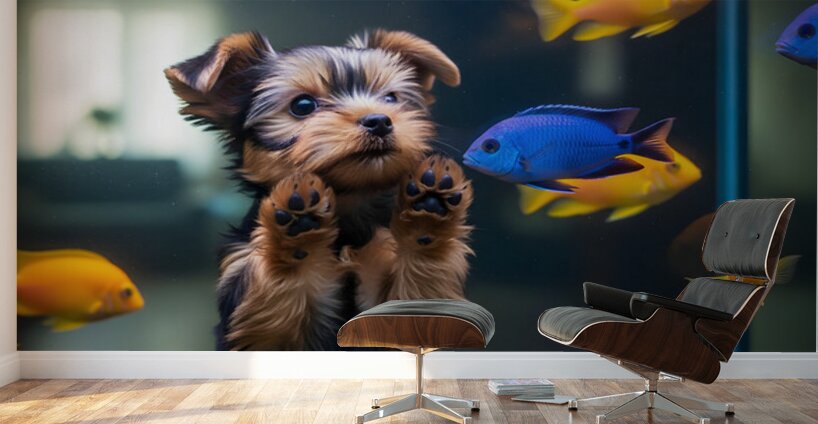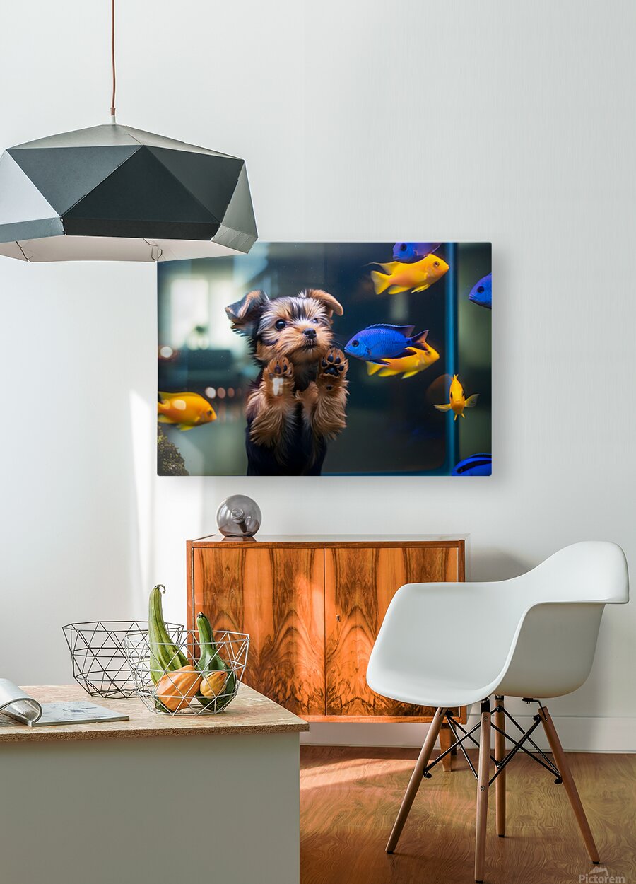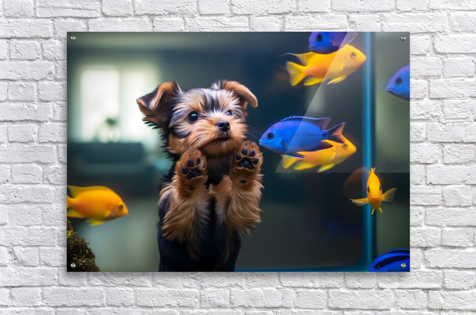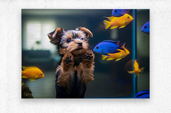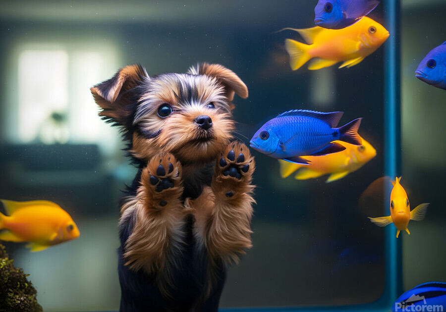 SUR CETTE OEUVRE: YORKSHIRE TERRIER PUPPY DISCOVERS AMAZING AQUARIUM WORLD