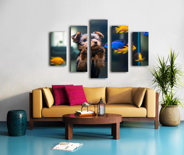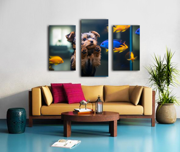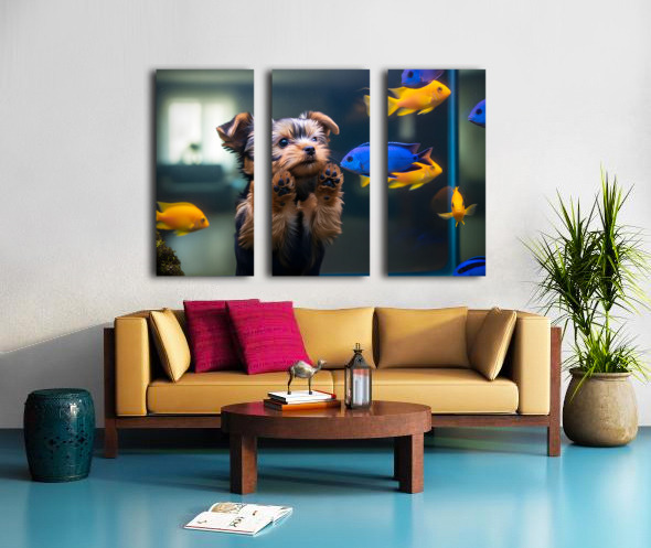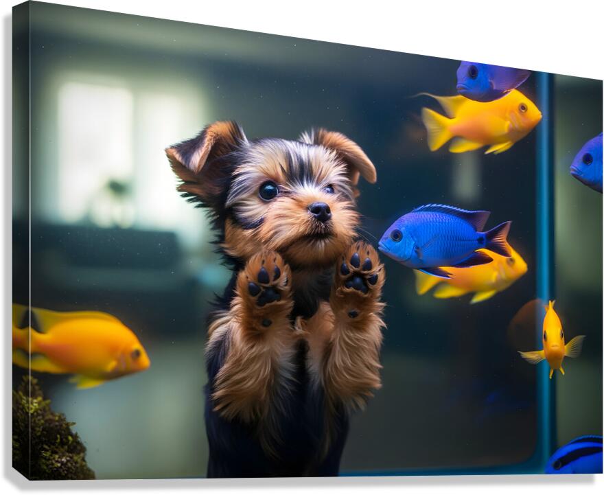 Yorkshire Terrier Puppy Discovers Amazing Aquarium World Impression sur toile
