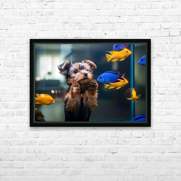 Yorkshire Terrier Puppy Discovers Amazing Aquarium World Impression du cadre