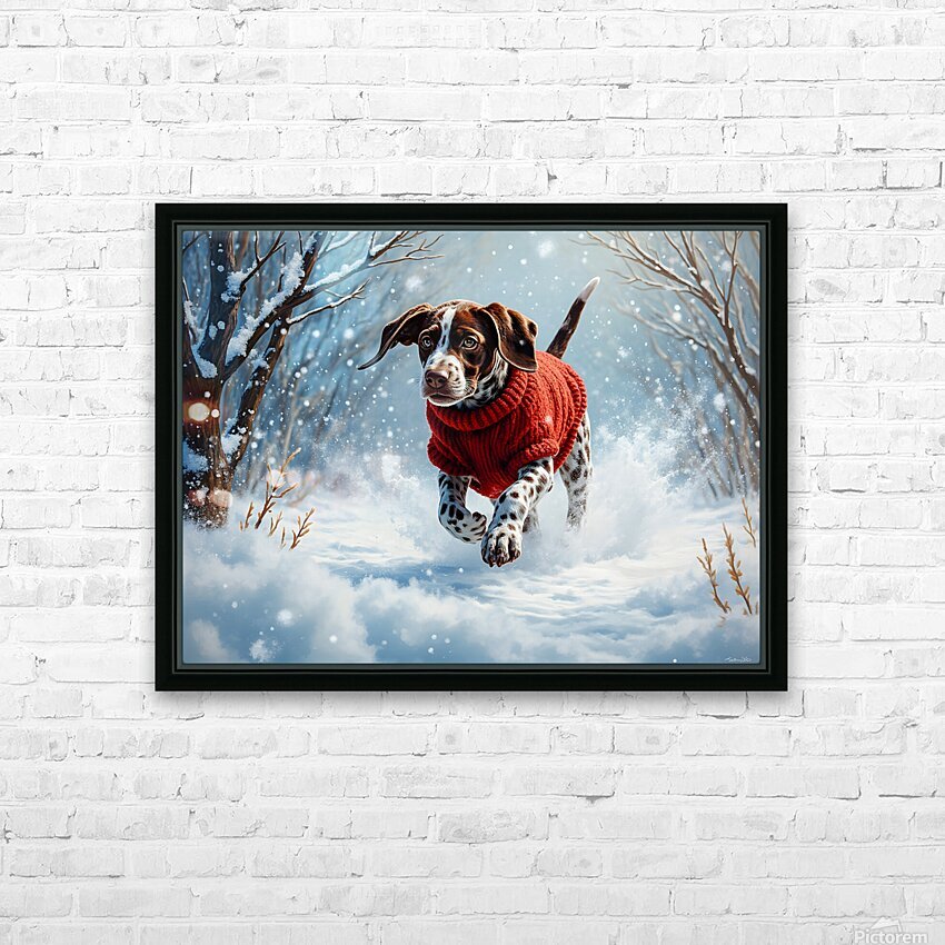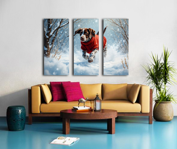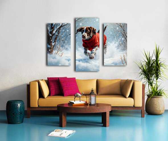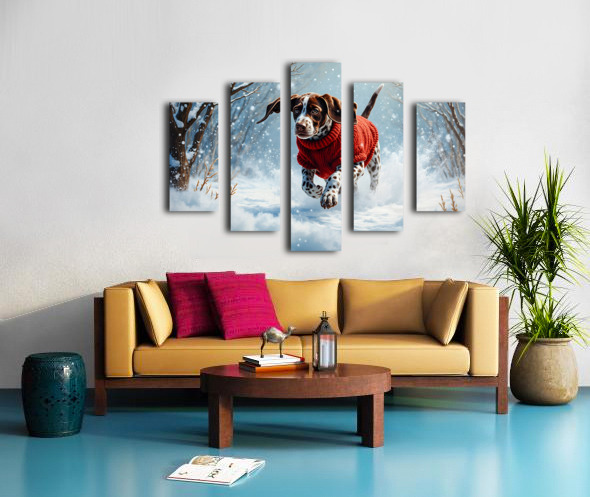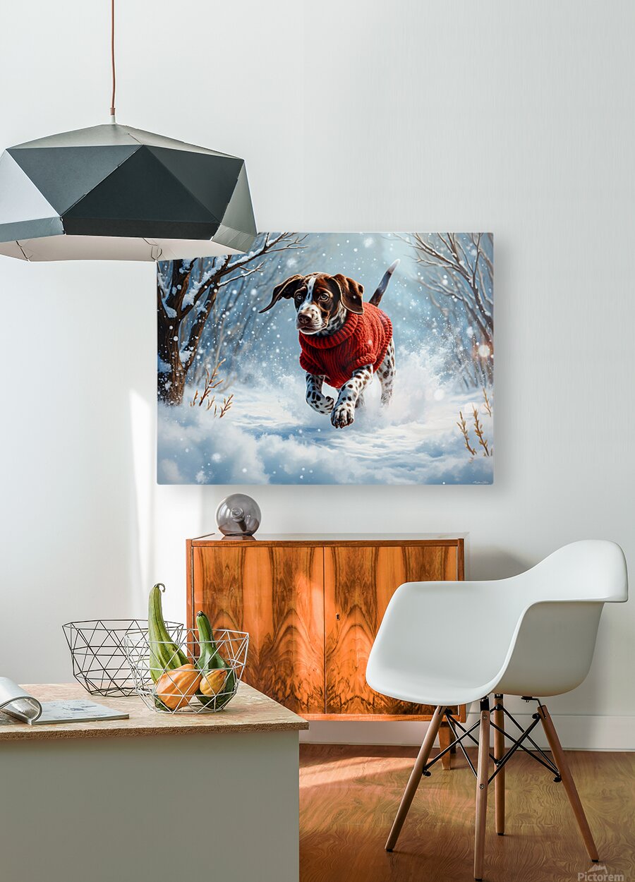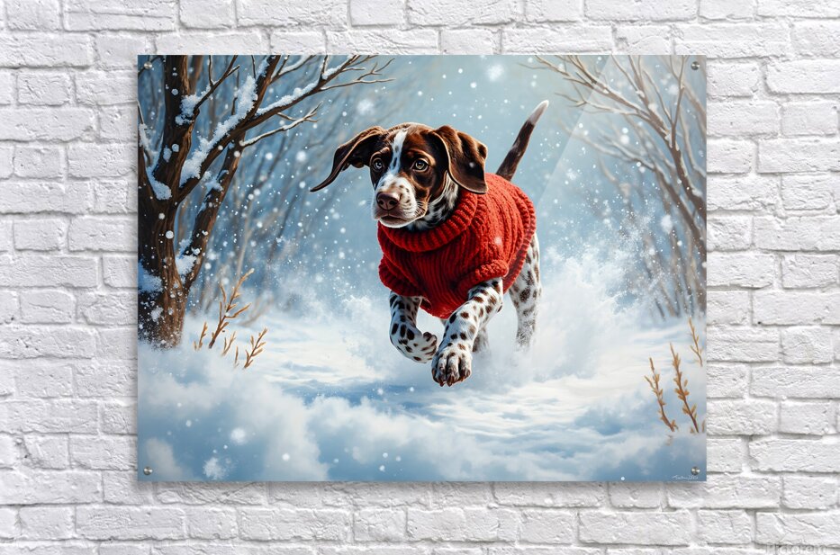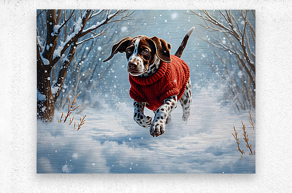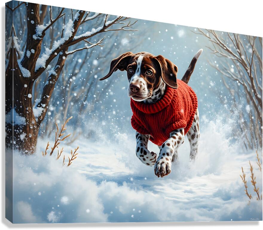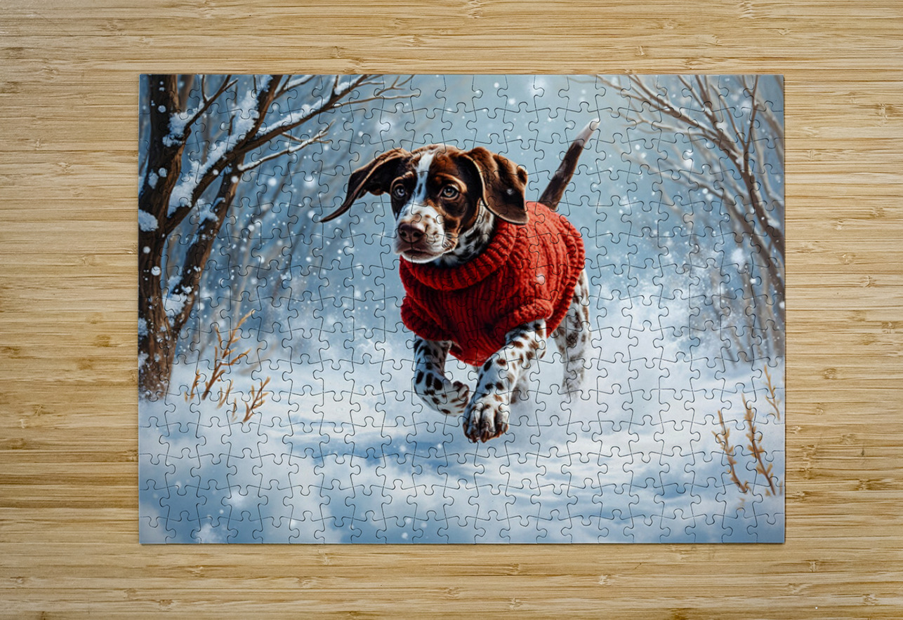 A content German Shorthaired Pointer puppy wearing a red knitted sweater with traces of snow rests peacefully on a soft indoor rug. The tired puppys relaxed expression shows satisfaction after an exciting winter adventure outside. Digital Artwork.
