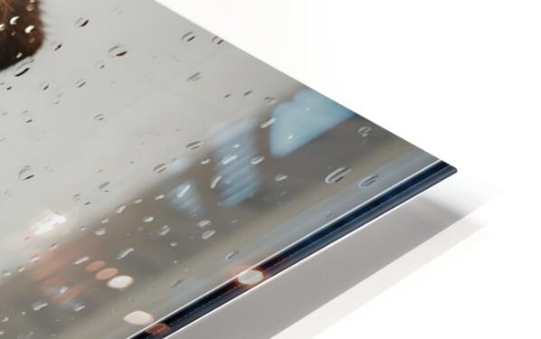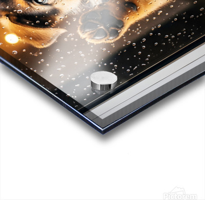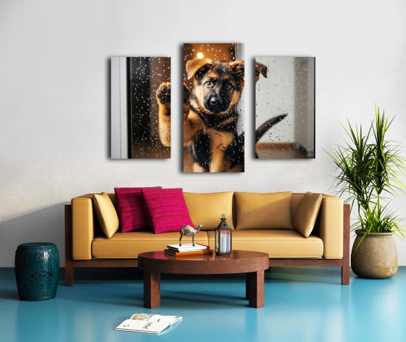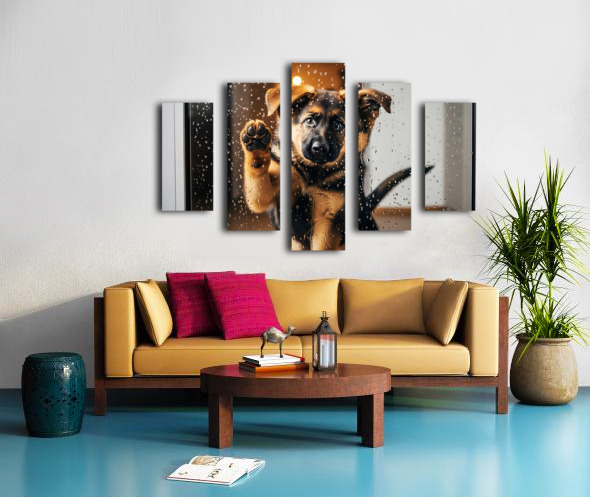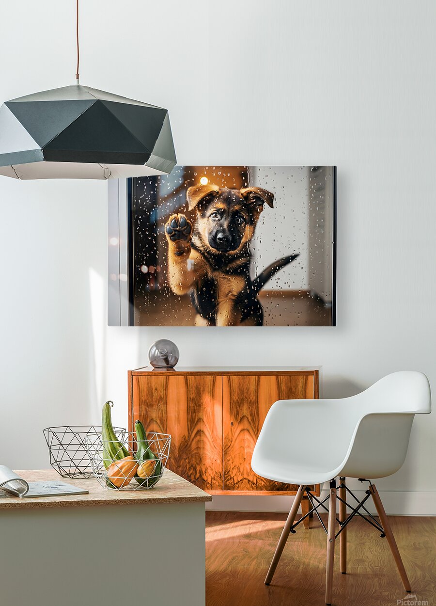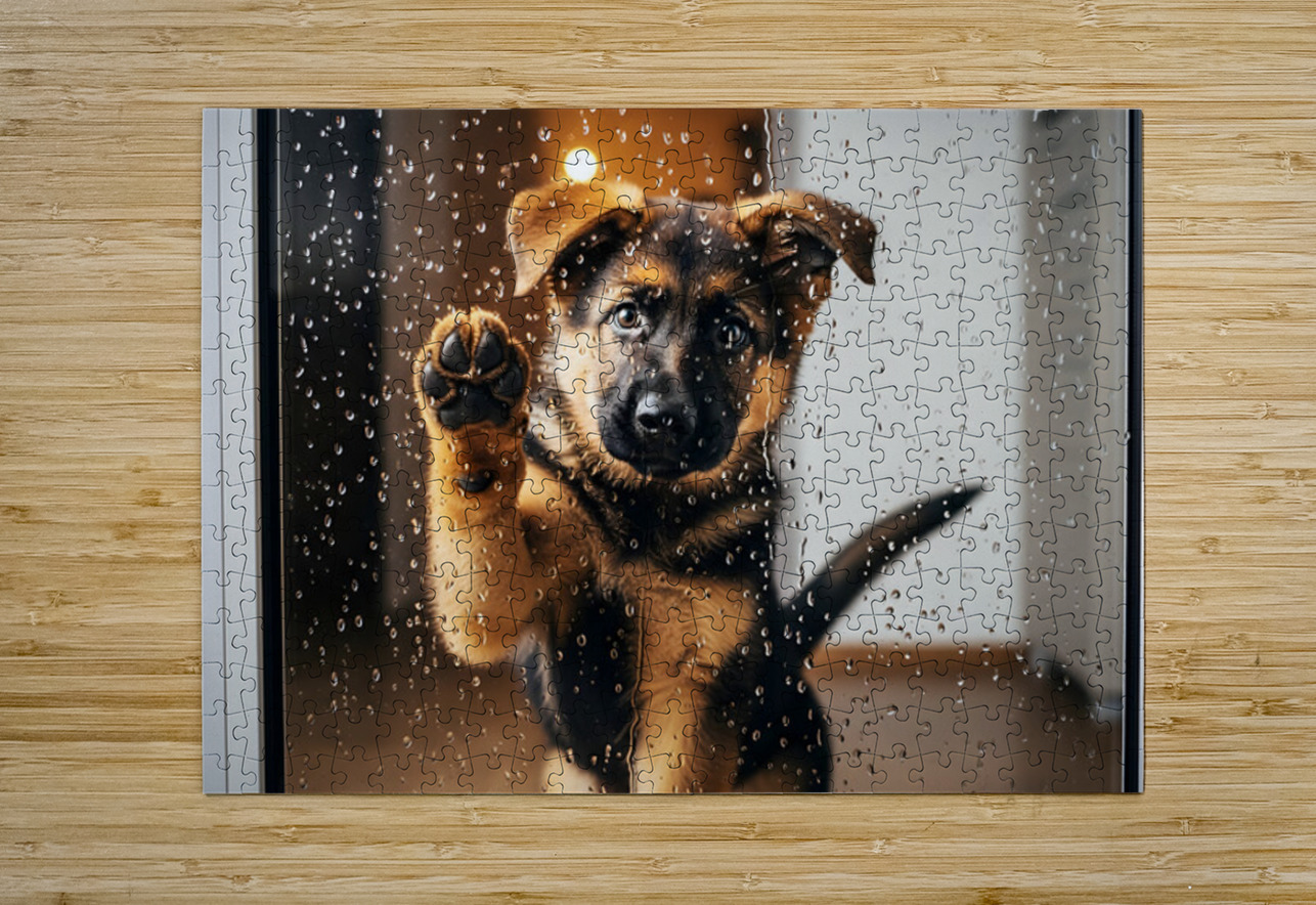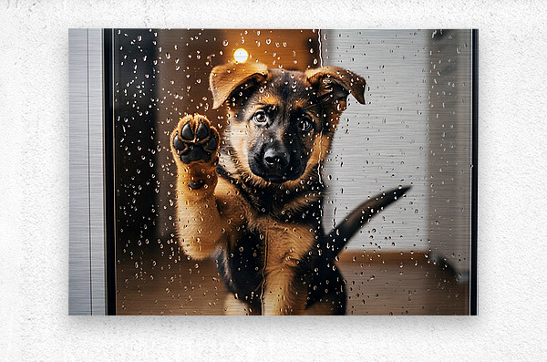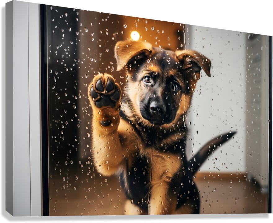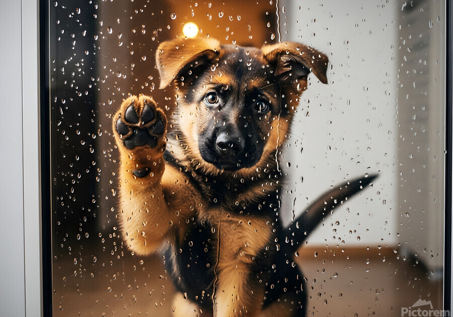 A German Shepherd puppy with brown and black fur sits with head tilted sideways looking confused and puzzled as raindrops continue streaming down the glass door Digital Artwork.