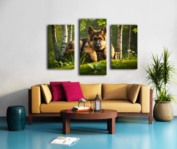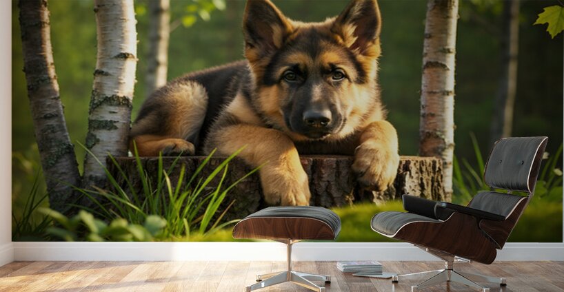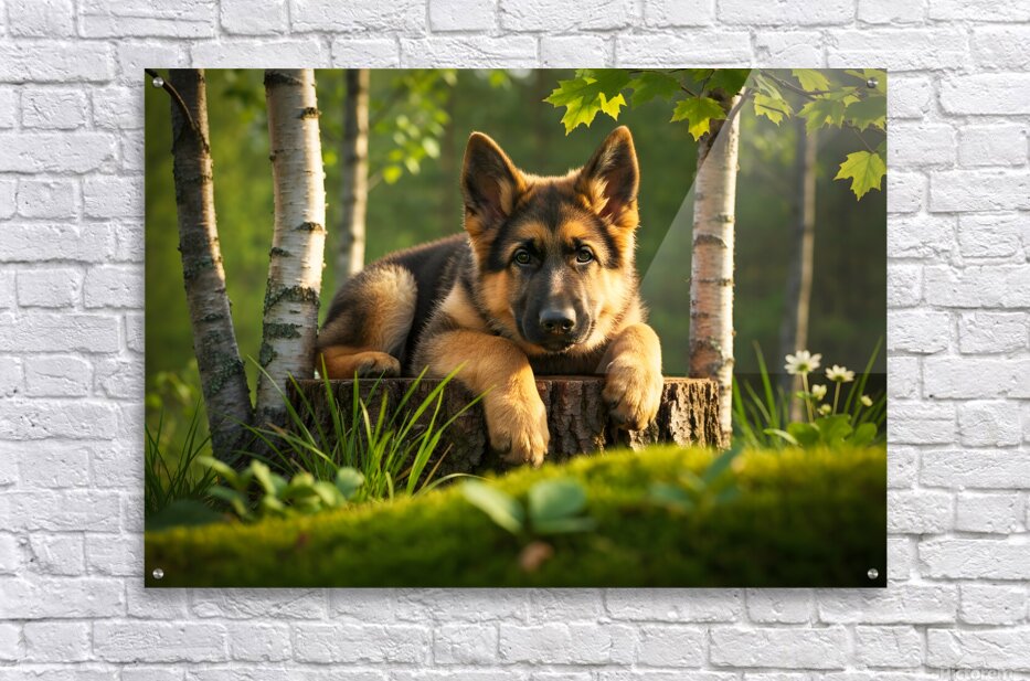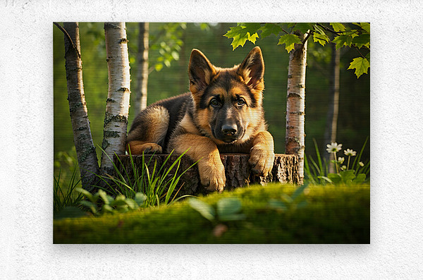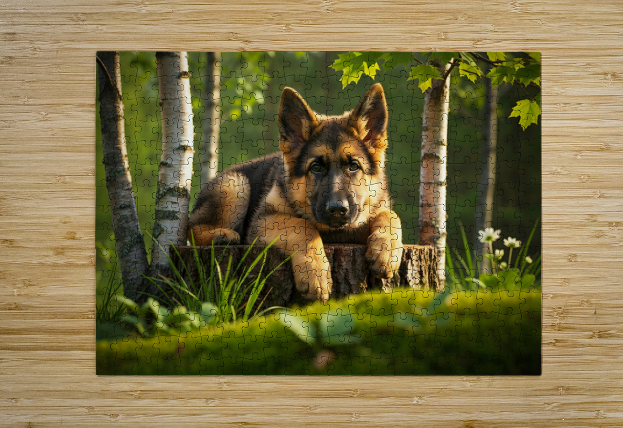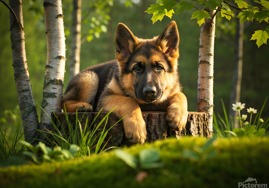 The German Shepherd puppy stands alert on his wooden throne gazing down with bright curiosity and wagging tail his golden and black coat beautiful in the warm afternoon forest light Digital Artwork.