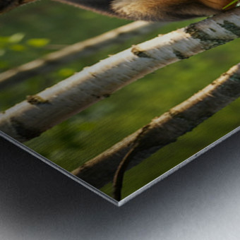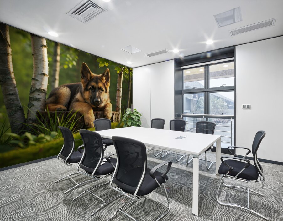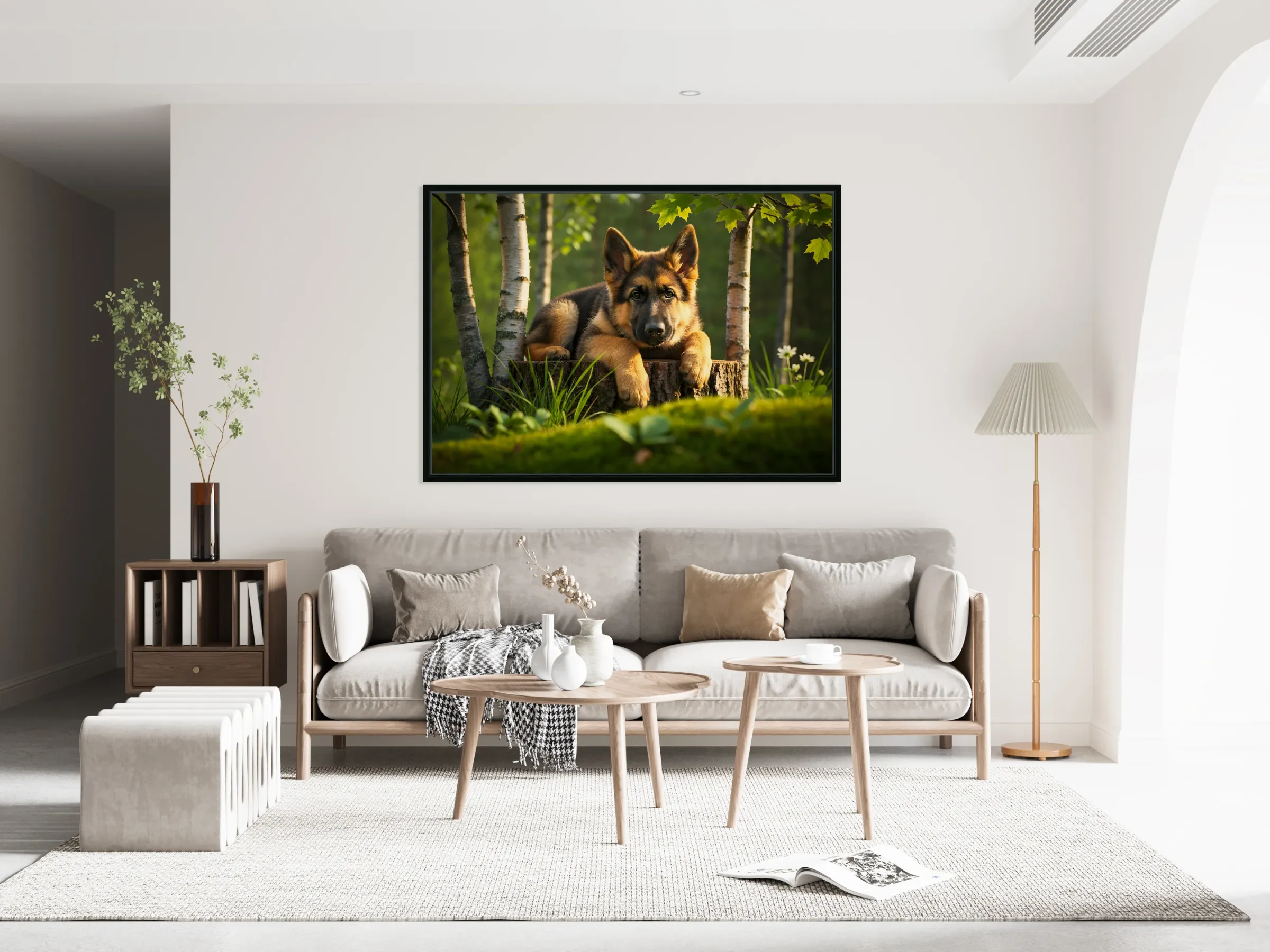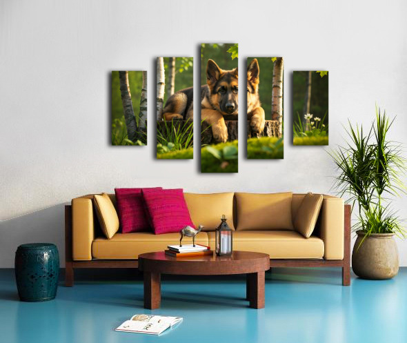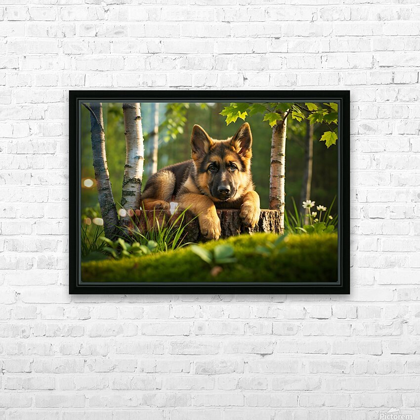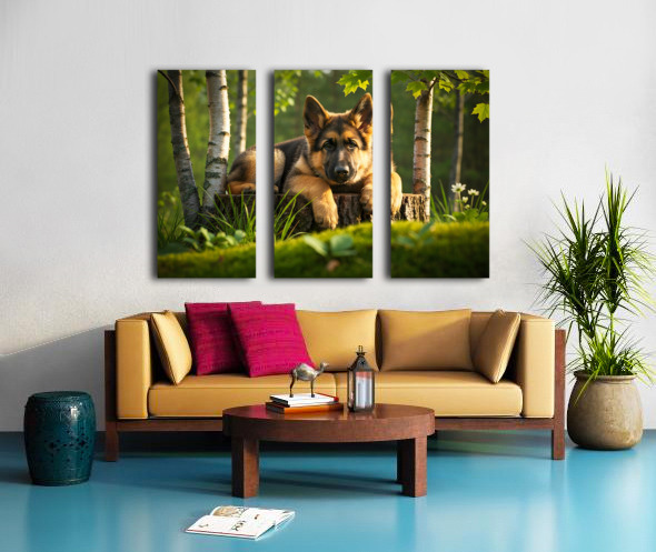 The German Shepherd puppy stands alert on his wooden throne gazing down with bright curiosity and wagging tail his golden and black coat beautiful in the warm afternoon forest light Digital Artwork.