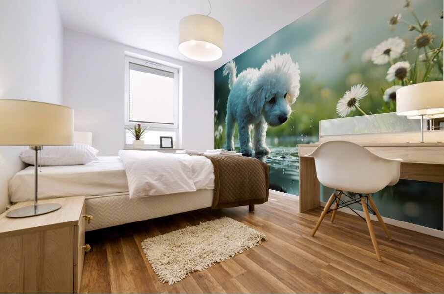 A white curly-haired poodle puppy stands beside a clear puddle gazing down with wonder at the waters surface. Her fluffy coat contrasts against the wet dark pavement with soft green vegetation blurred in the foreground. Digital Artwork.