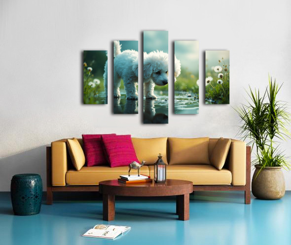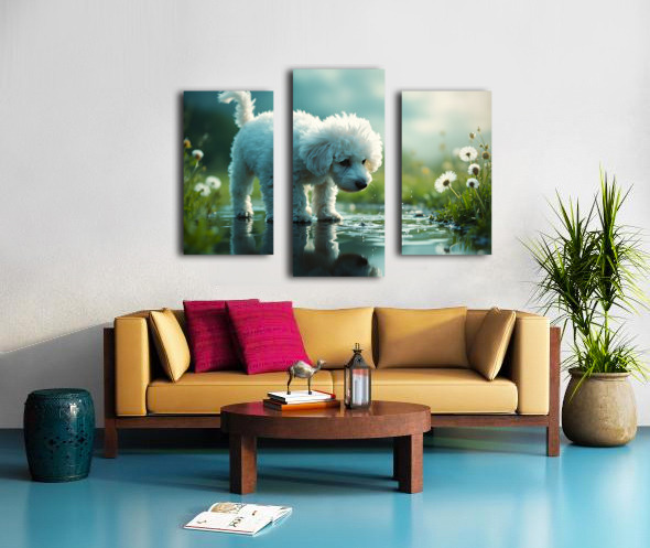Poodle Puppy Discovers Her Reflection In A Puddle Impression sur toile