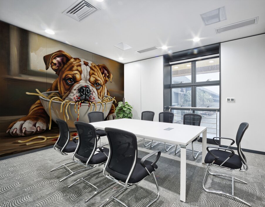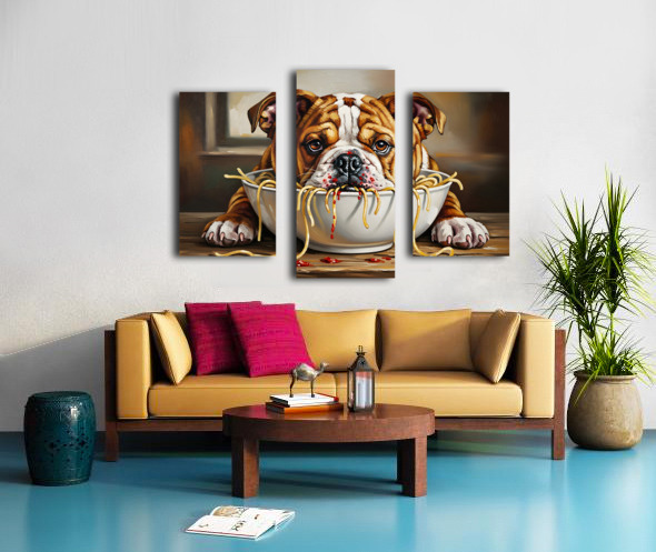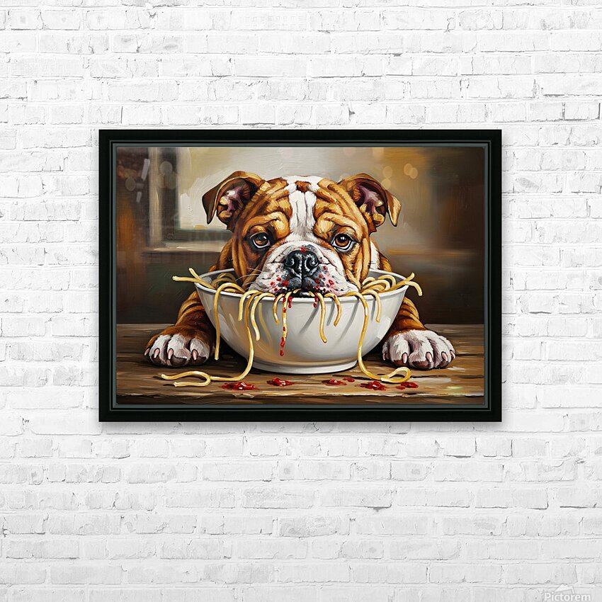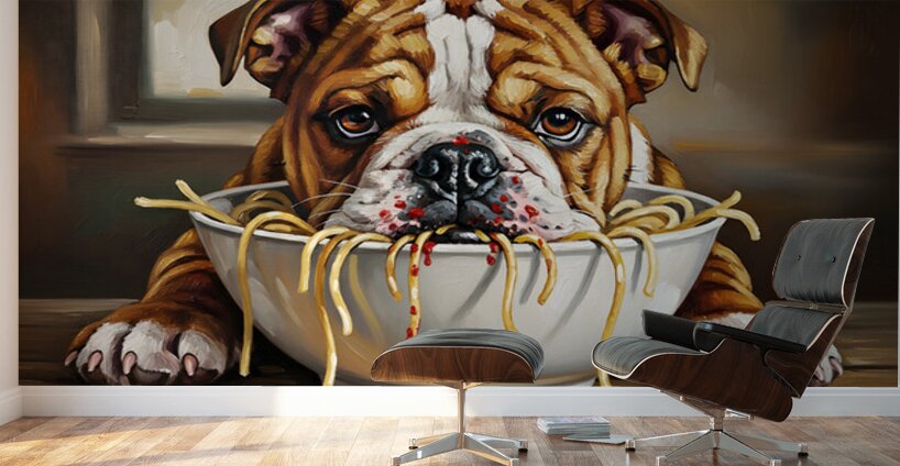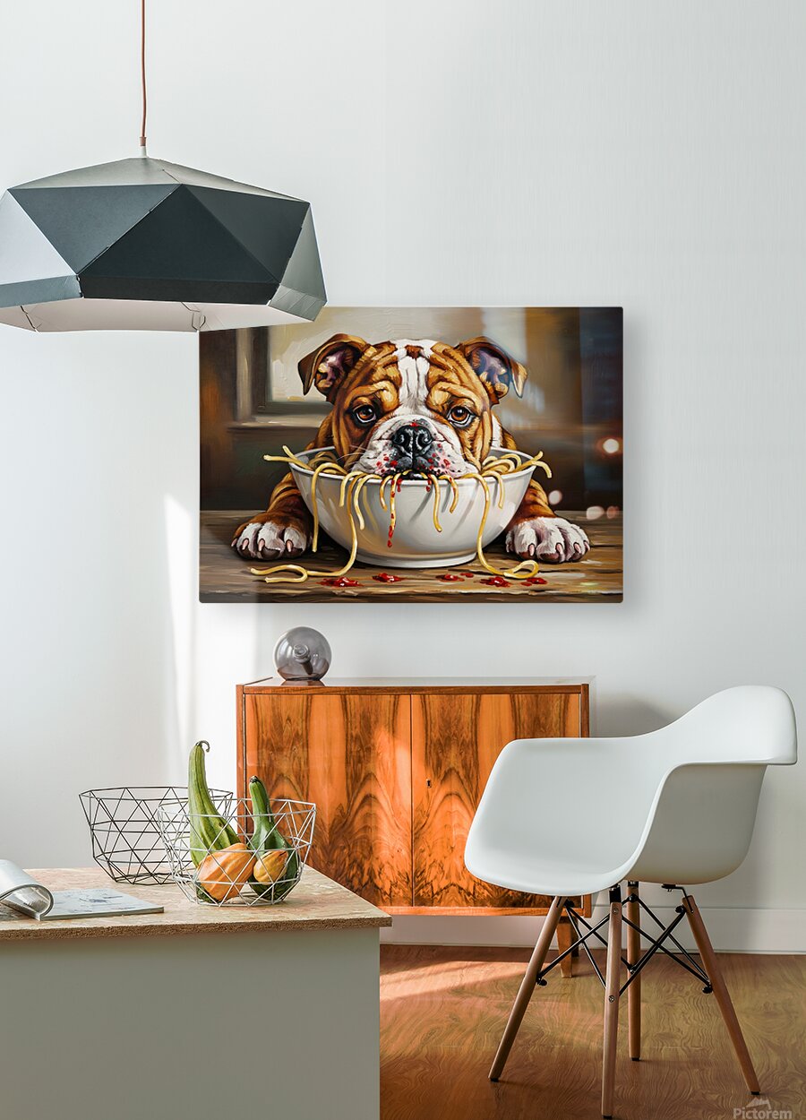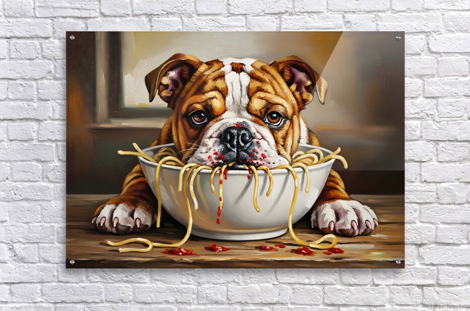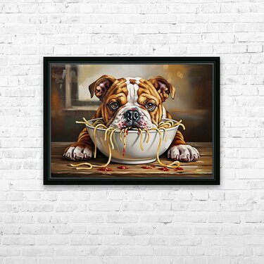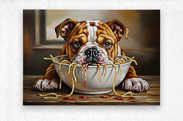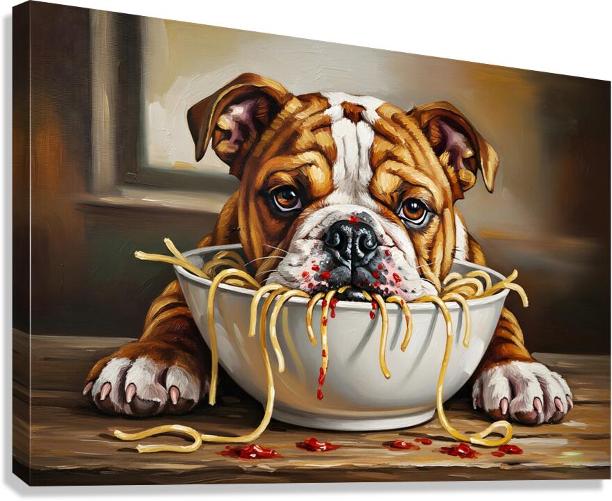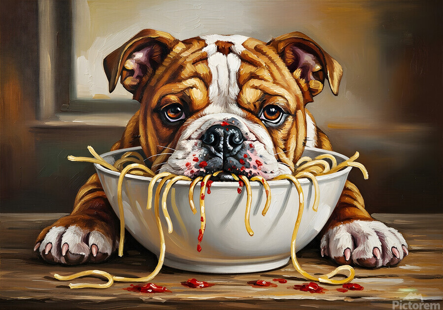 SUR CETTE OEUVRE: BULLDOG PUPPY DISCOVERS SPAGHETTI DINNER