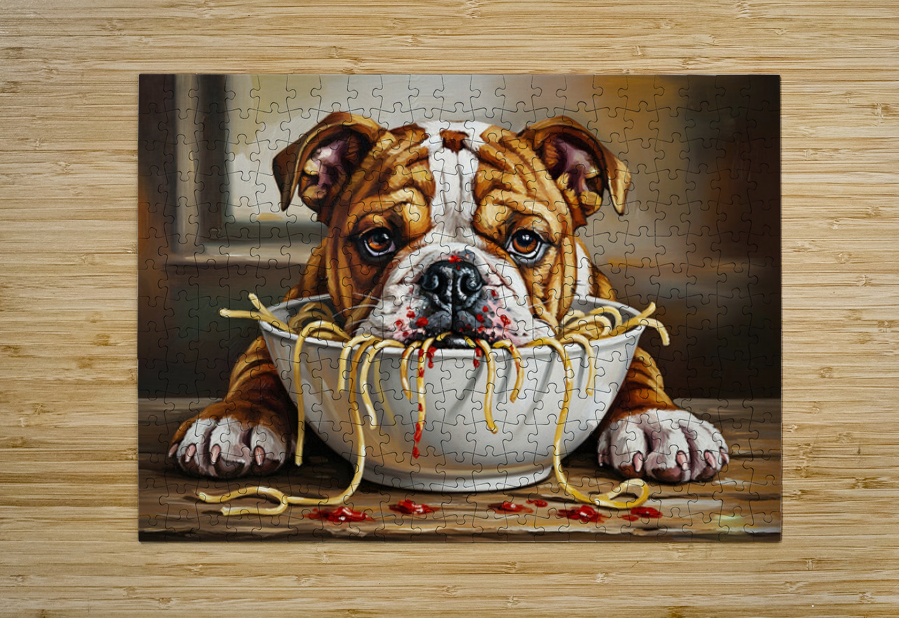 Bulldog Puppy Discovers Spaghetti Dinner Puppy Prints Impression de puzzle
