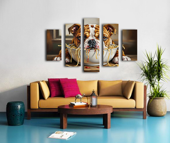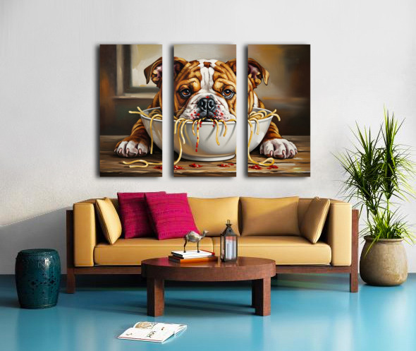 Bulldog Puppy Discovers Spaghetti Dinner Impression sur toile
