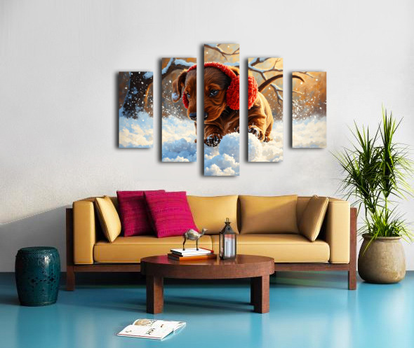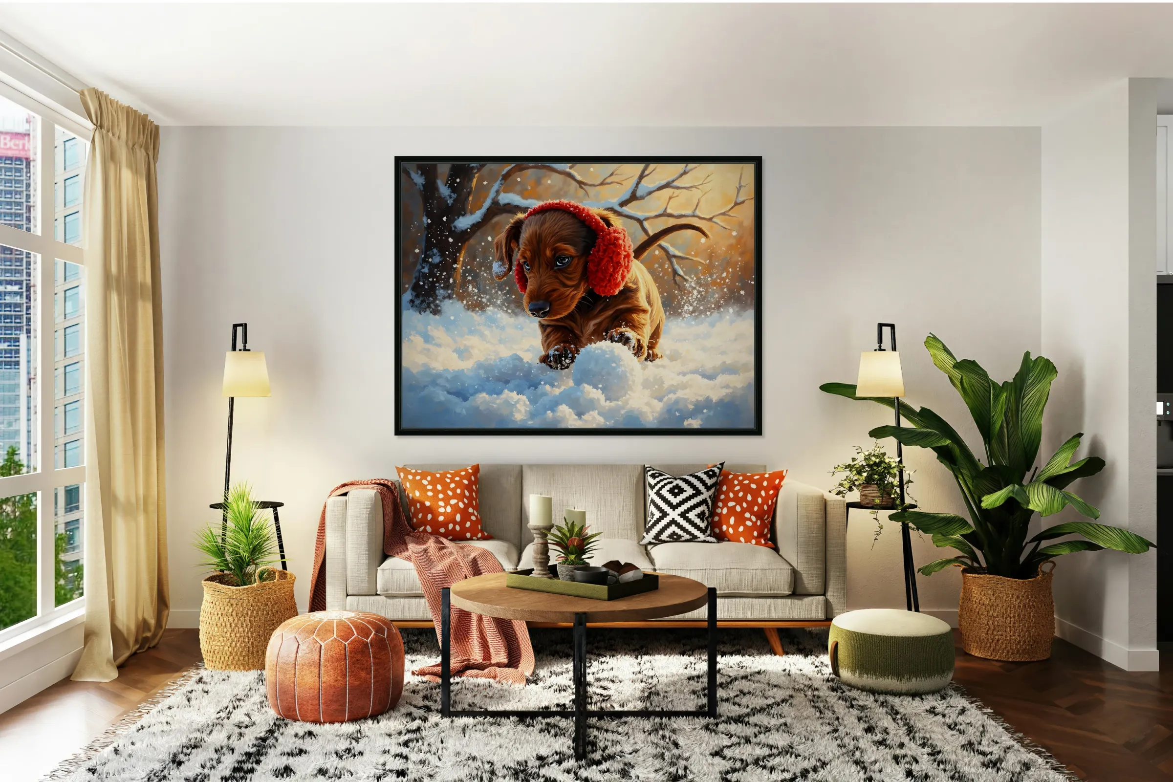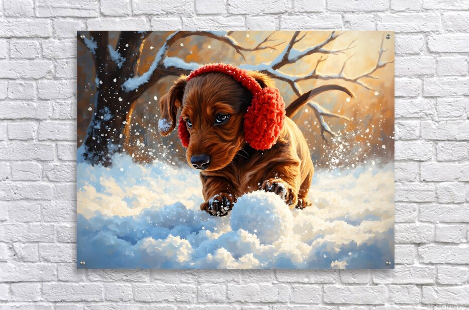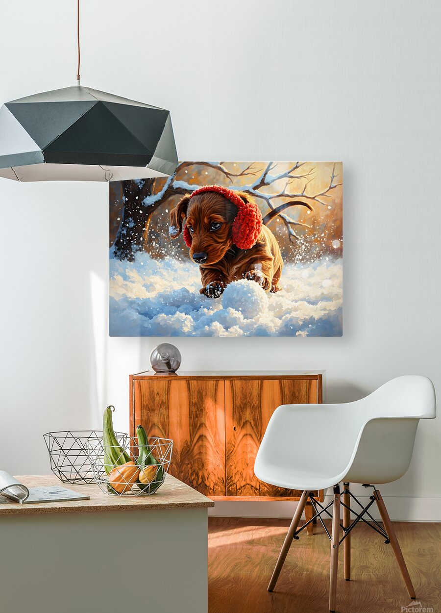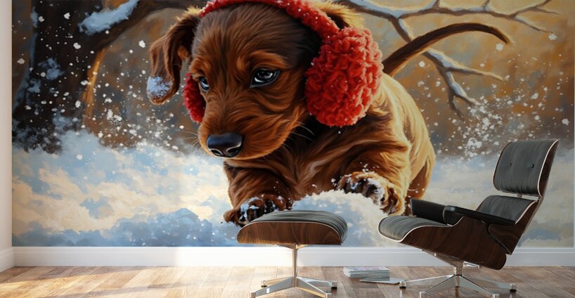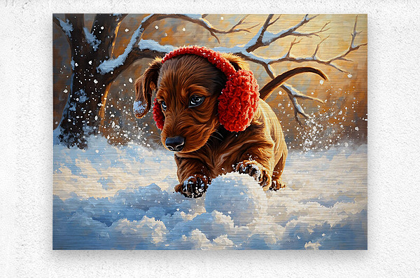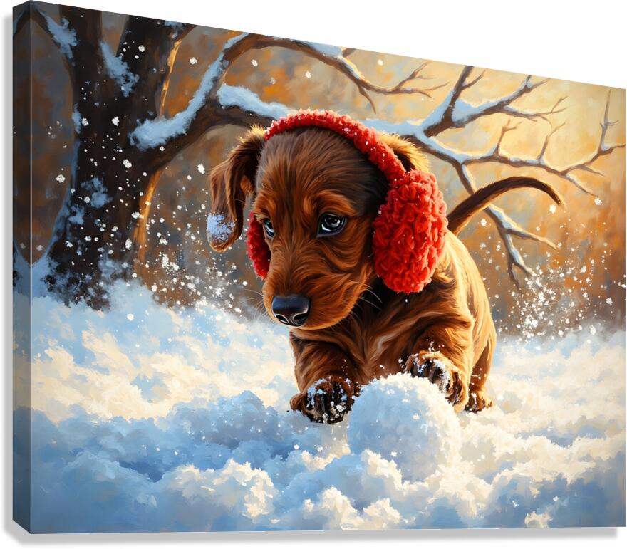 SUR CETTE OEUVRE: DACHSHUND PUPPYS FIRST SNOWY ADVENTURE WITH EARMUFFS