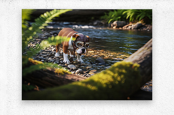 A content brown and white bulldog puppy wearing crooked aviator goggles rests peacefully on soft grass beneath an oak tree. The tired adventurer enjoys the golden afternoon light after exploring. Digital Artwork.