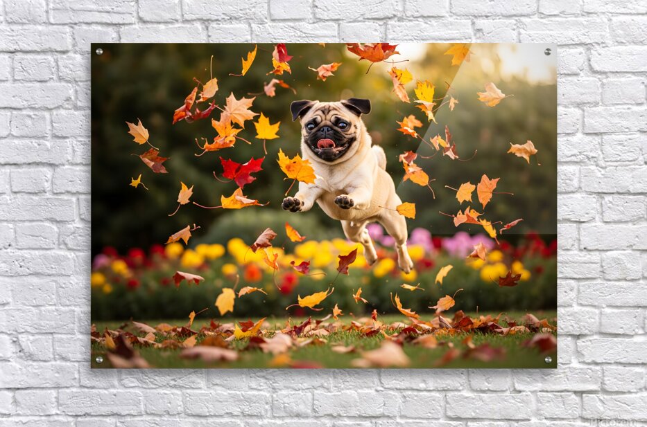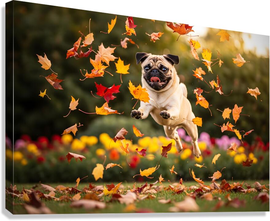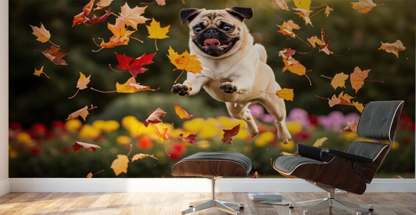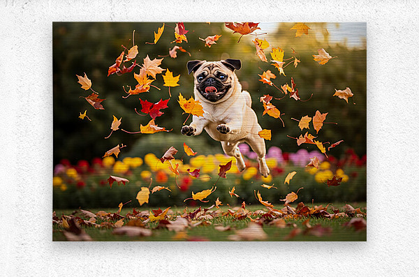 A content tan pug puppy with distinctive black markings rests peacefully on green grass tongue hanging out in satisfaction after an energetic play session. Colorful fallen leaves are scattered nearby while soft garden blooms blur gently in the background. Digital Artwork.