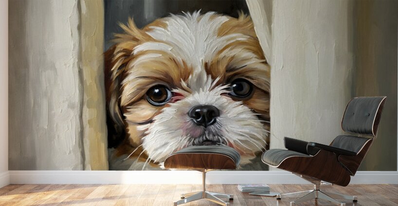 A adorable Shih Tzu puppy with golden and white fluffy fur attempts to hide behind a cream curtain in a warm living room but their bushy tail gives away their location as it peeks out from the fabric Digital Artwork.