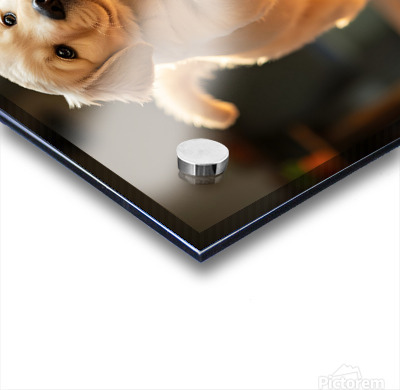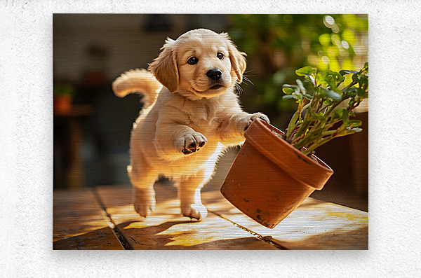 An adorable golden retriever puppy with fluffy cream fur stretches up on its back legs trying to reach a terracotta plant pot sitting on a wooden table. The puppys front paws are extended upward with an eager playful expression. Digital Artwork.