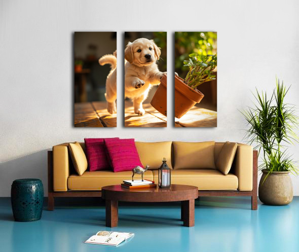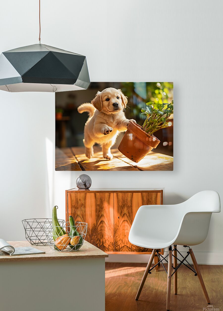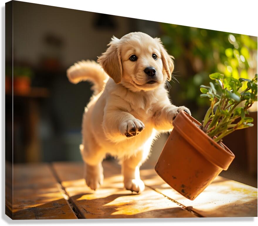 Golden Retriever Puppy Reaches For Plant Pot Impression sur toile