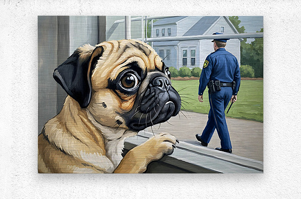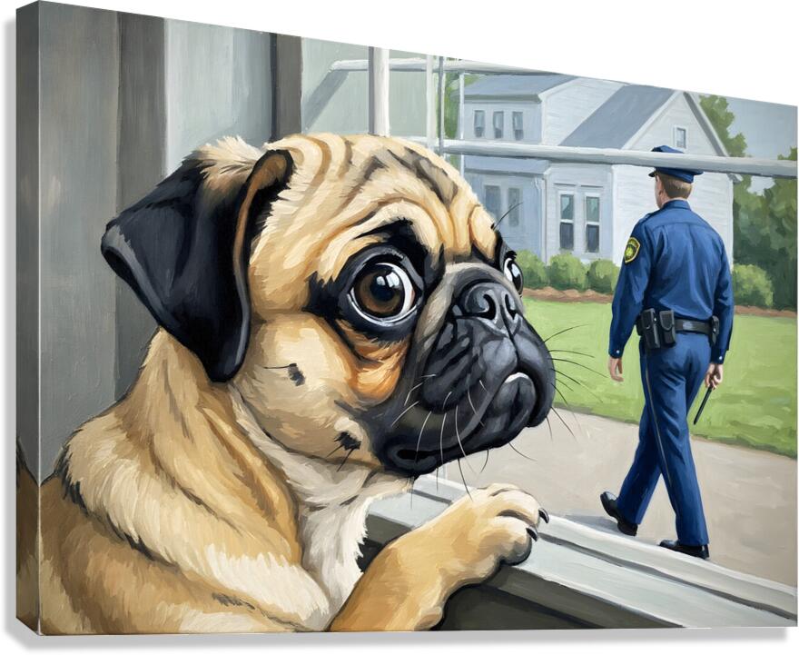 SUR CETTE OEUVRE: PUG PUPPY SITS PROUDLY AFTER SUCCESSFUL GUARD DUTY