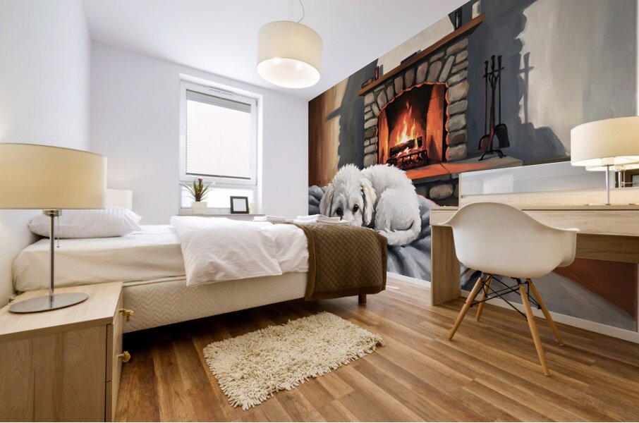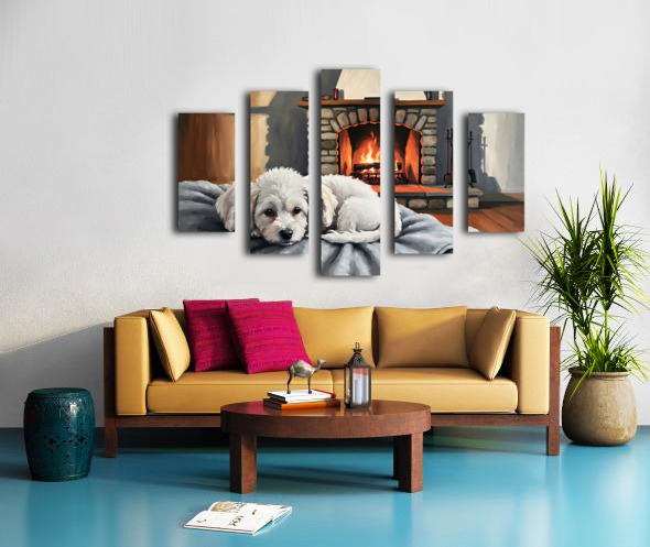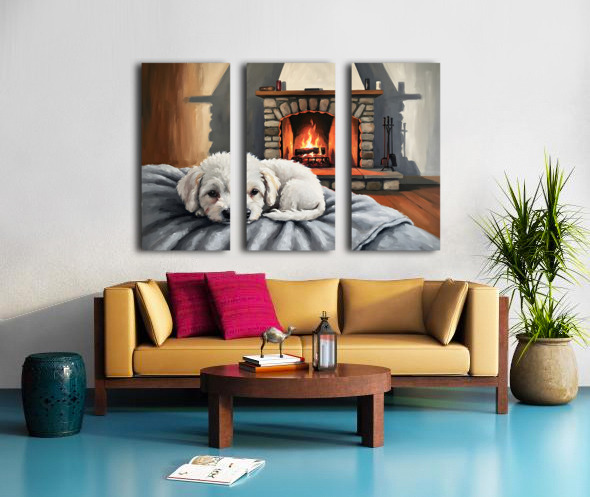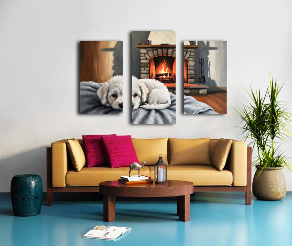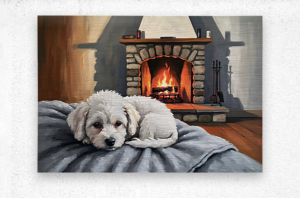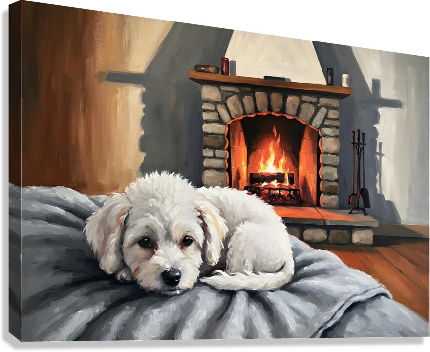 SUR CETTE OEUVRE: BICHON FRISE PUPPY DREAMS BY THE FIREPLACE