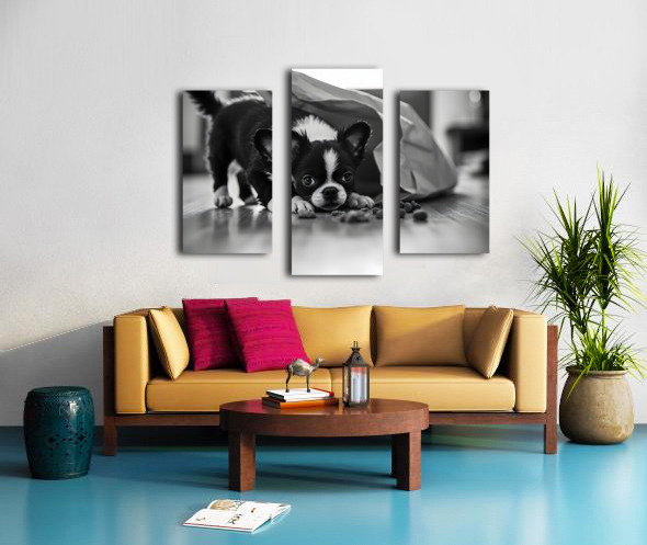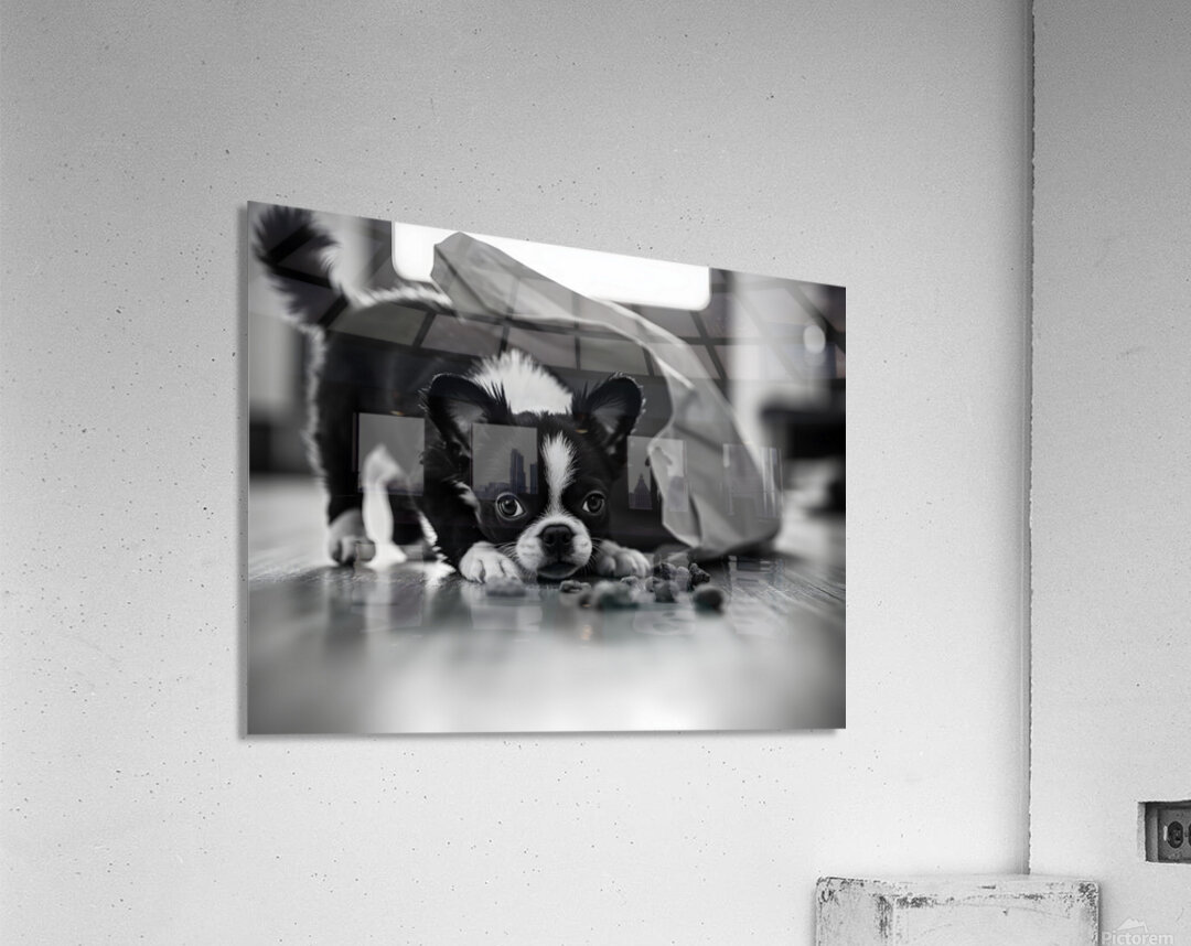 SUR CETTE OEUVRE: EXCITED BOSTON TERRIER PUPPY EMERGES FROM SHOPPING BAG DISCOVERY