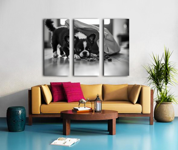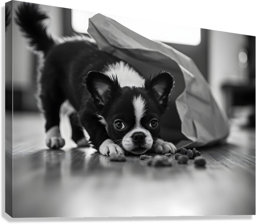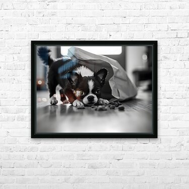 A delighted black and white Boston Terrier puppy emerges from a brown shopping bag with bright eyes and perked ears having discovered a small treasure during its exploration on wooden flooring. Digital Artwork.