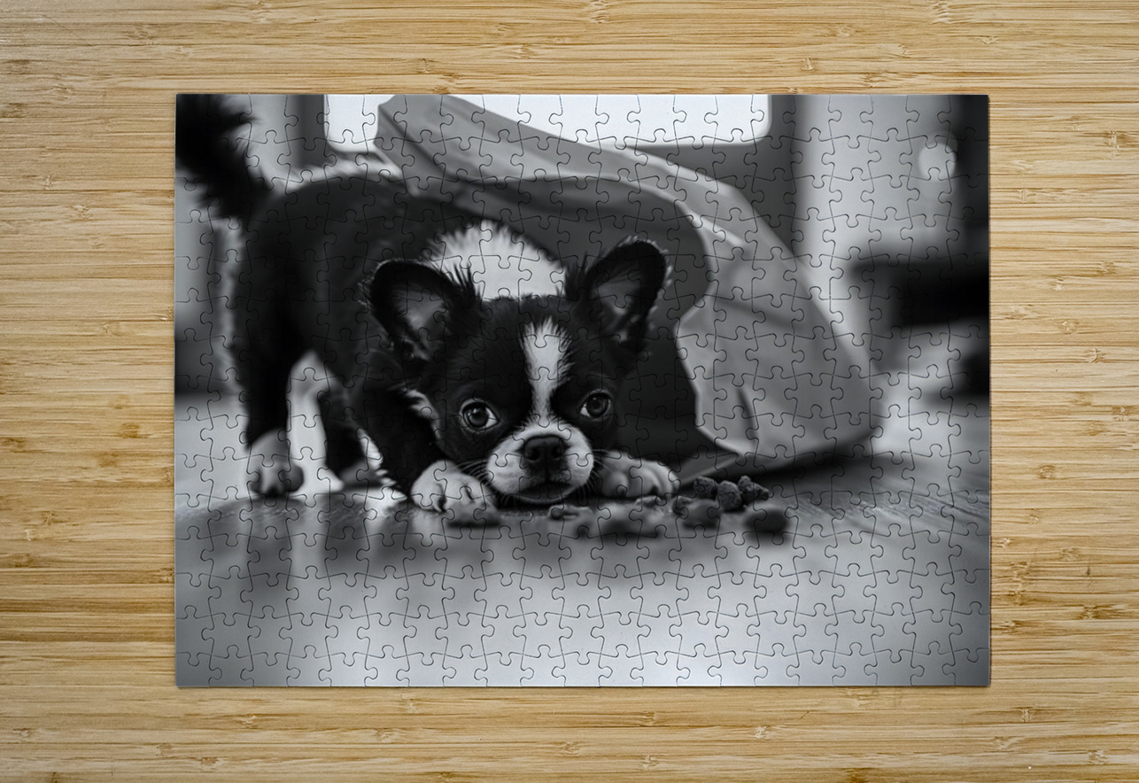 Excited Boston Terrier Puppy Emerges From Shopping Bag Discovery Puppy Prints Impression de puzzle