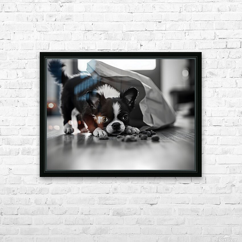 Pour obtenir "Excited Boston Terrier Puppy Emerges From Shopping Bag Discovery" dans une impression encadrée.