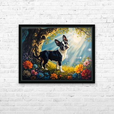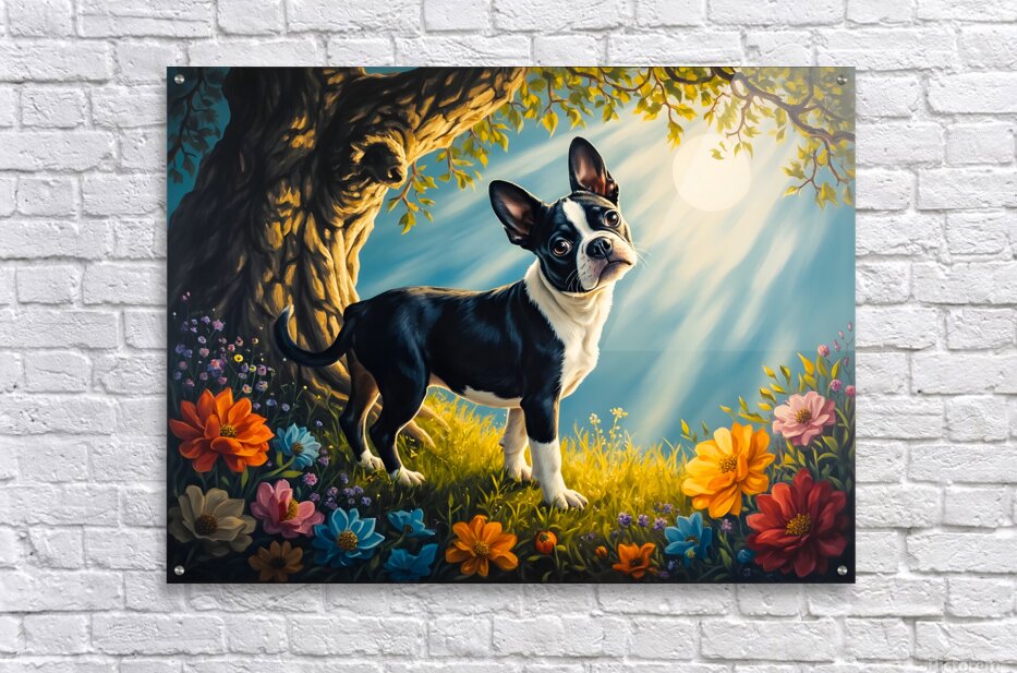 SUR CETTE OEUVRE: SLEEPY BOSTON TERRIER PUPPY RESTS AFTER SHADOW ADVENTURE